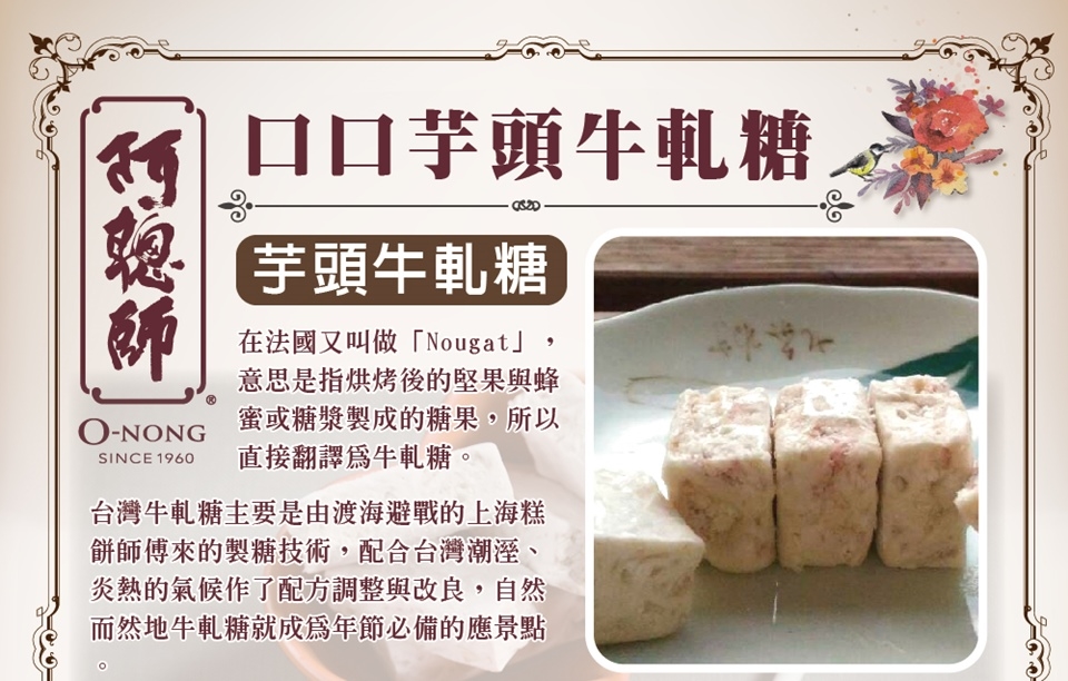 成分 : 芋頭牛軋糖:芋頭條、麥芽飴、全脂奶粉、海藻糖、砂糖、奶油、蛋白、洋菜粉、食鹽、芋頭香料(丙二醇食用色素紅色6號、紅色7號、紅色40號、藍色1號、甜味劑(D-山梨醇液70%))